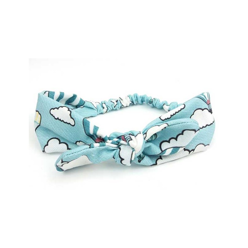 Turbante para bebé a juego con todos nuestros artículos con esta tela especial de cosamui con globos aeroestáticos en tonos azul, amarillo y blanco.