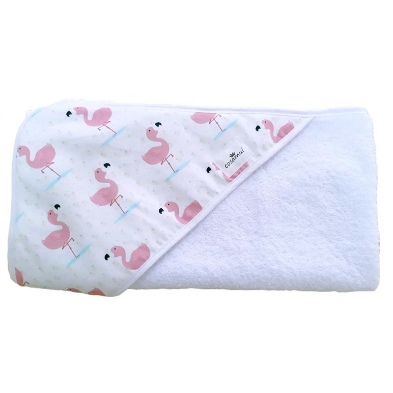 Capa de baño para recién nacido de la colección flamencos y piñas. Para que el bebé salga bien abrigadito del agua, tanto en invierno como para verano.