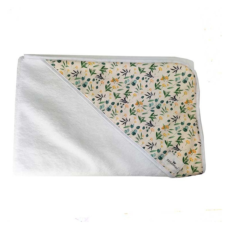 Capa de baño para recién nacido o bebé de nuestra tela olivo, diseño único de cosamui. Una capa de baño ideal para la ducha en invierno y para la playa o piscina en verano.