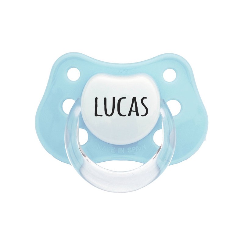 Chupete personalizado con nombre color azul. Puedes personalizar el nombre de tu bebé en el chupete.