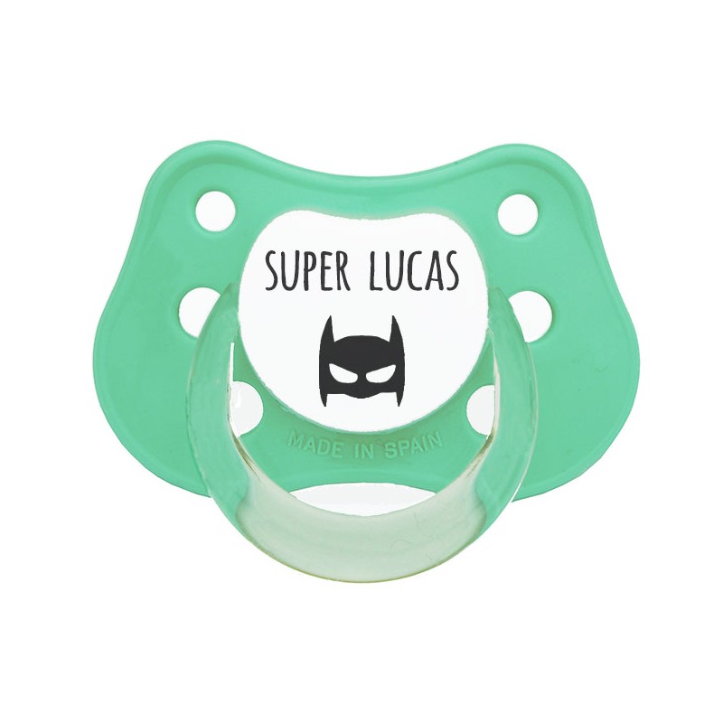 Chupete personalizado con nombre. Detalle de super héroe. Puedes poner un nombre o una frase de hasta 10-15 caracteres.