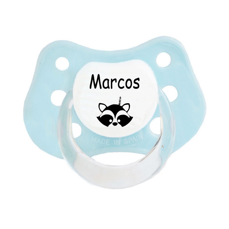 Chupete para bebé. Chupete personalizado color azul de la colección mapache. Tetina de latex o silicona anatómicas.
