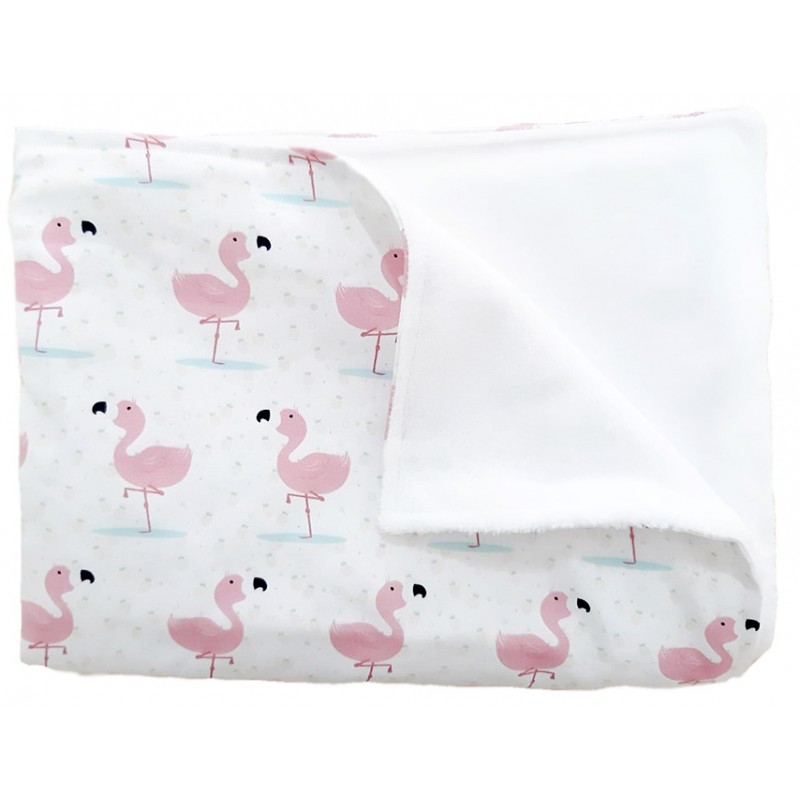 Manta para bebé con flamencos color rosa y fondo blanco. Diseño exclusivo cosamui.