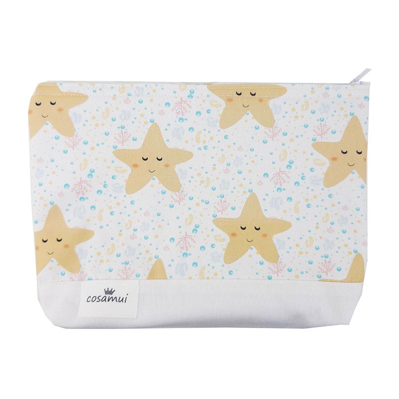 Neceser con interior impermeable de la colección de estrellas de mar, no lo encontrarás en otro sitio, diseño y confección exclusiva en cosamui. Ideal para guardar las cremitas, chupetes, las toallitas del bebé, etc.
