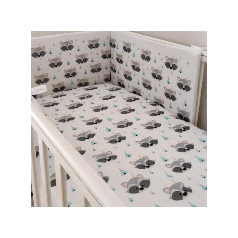 Sábana algodón 100% (200 hilos) para cuna 60x120 o 70x140 de nuestra colección de Mapaches mini. Medidas 105x135cm o 150x120cm.